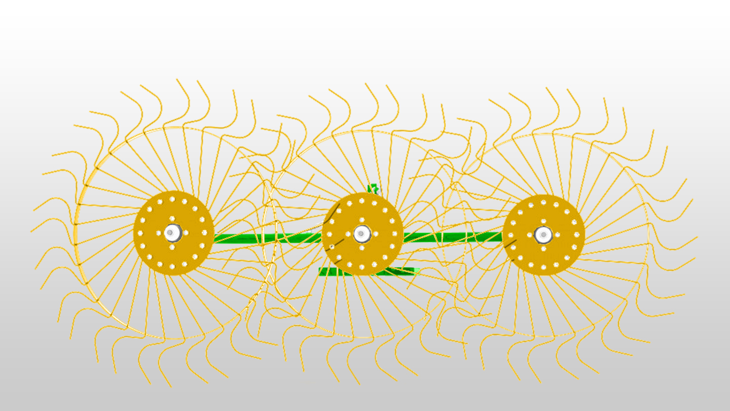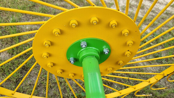 Рабочие колеса граблей имеют диаметр 1,2 метра, они оснащены спицами заводского производства, изготовленными из высокопрочной пружинной стали толщиной 6 мм и окрашены порошковой краской. Диск крепления спиц усилен в сравнении с польскими производителями, имеет толщину 5 мм. Колеса установлены на двух 205 подшипниках, что обеспечивает надежную и длительную эксплуатацию. Усиленная несущая труба граблей с толщиной стенки 3,5 мм придает конструкции дополнительную прочность.