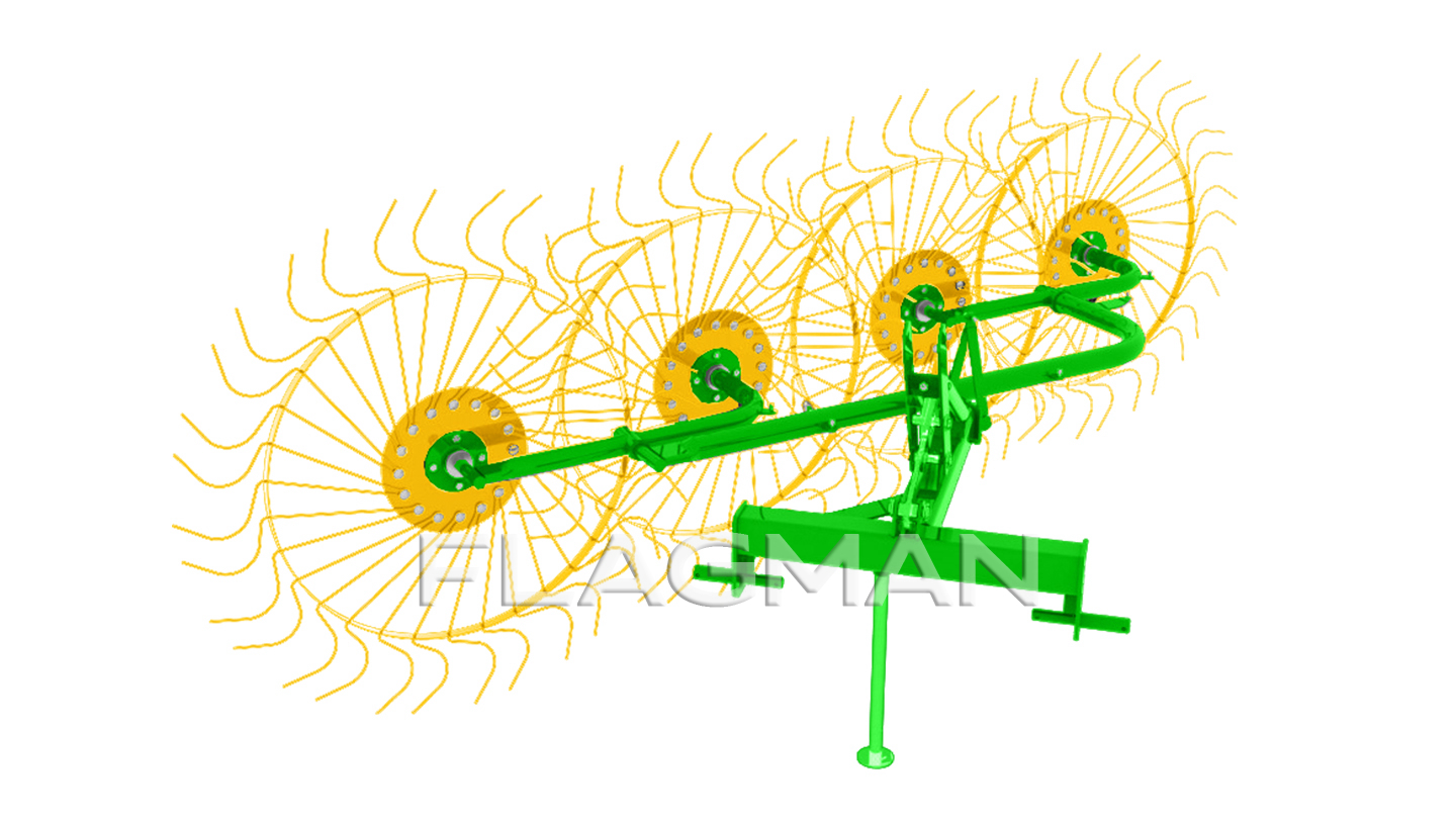 Грабли-сеноворошилки Flagman RR-04 используются для уборки и ворошения сеяных трав и естественных сенокосов урожайностью выше 15 ц/га, влажностью убираемой массы от 25% до 80%. Предназначены для работы на ровных участках, а также в районах с трудным доступом к сенокосным угодьям. Для работы не требуется ВОМ. При движении трактора грабли сцепляются с почвой и начинают синхронно вращаться.