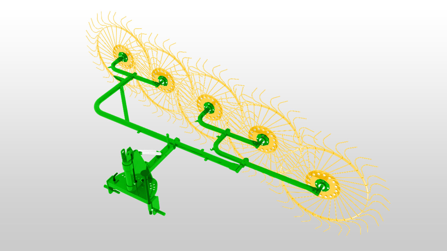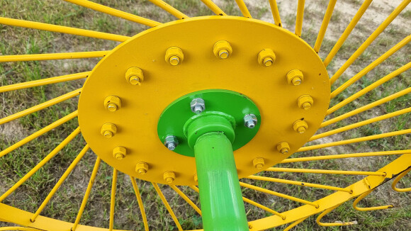 Рабочие колеса граблей имеют диаметр 1,2 метра и оснащены спицами заводского производства, изготовленными из высокопрочной пружинной стали толщиной 6 мм и окрашены порошковой краской. Диск крепления спиц усилен и имеет толщину 5 мм. Колеса установлены на двух 205 подшипниках, гарантируя надежную и длительную эксплуатацию.