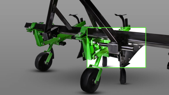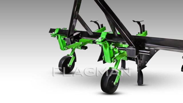 Глубина обработки регулируется с помощью крепежных соединений, которые расположены на каждой секций и удерживают съемные окучники, пропольники, рыхлители. Каждый элемент регулируется и фиксируется отдельно. Равномерность заглубления всего агрегата обеспечивают опорные колеса и демпфирующие пружины на каждой из секций.