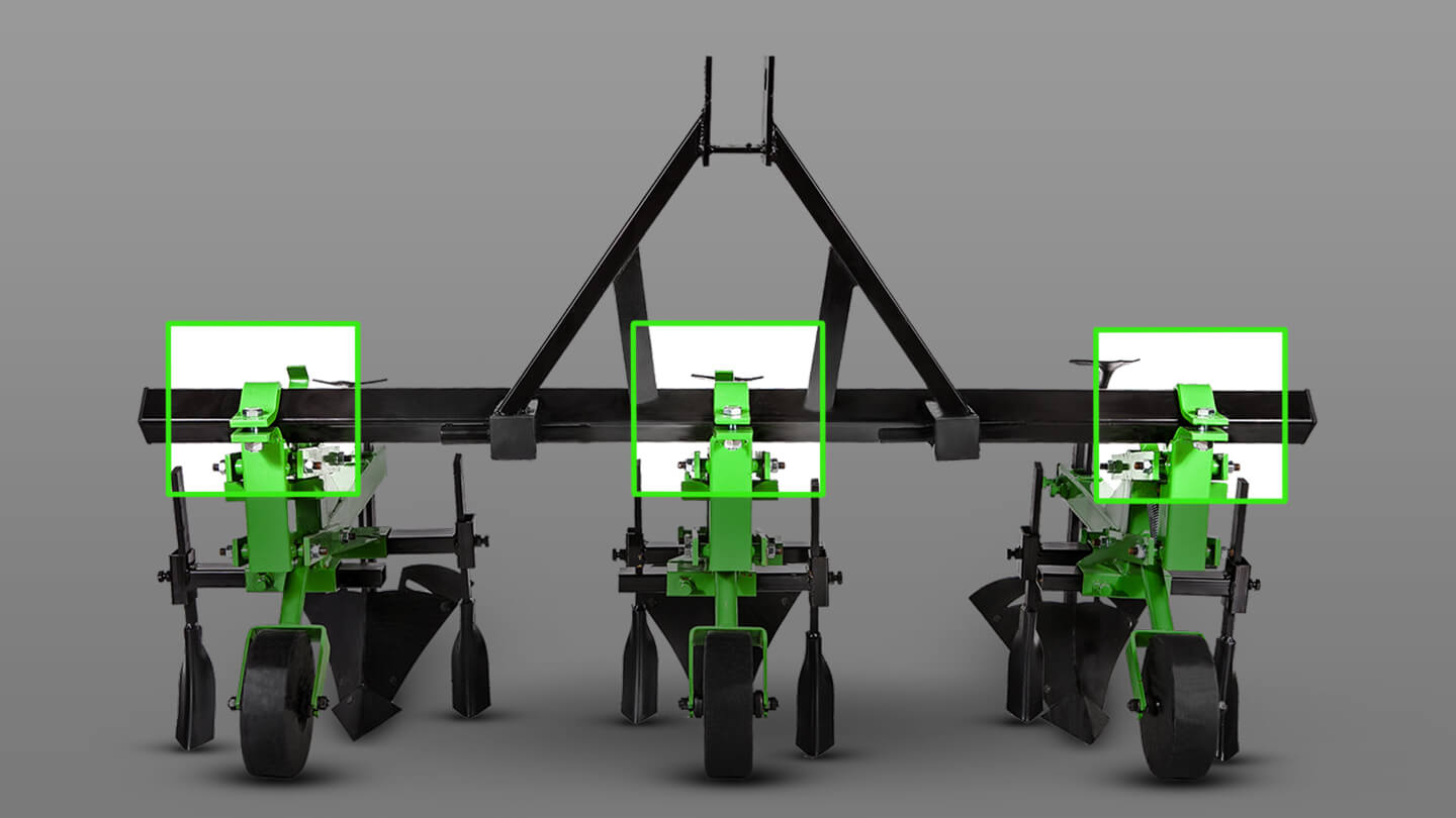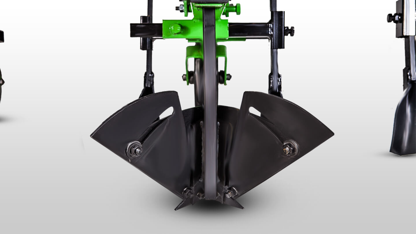 Специальная форма окучников позволяет создавать высокие гребни и не повреждать при этом корневую систему растений, а простые регулировки крыльев окучников позволяют менять высоту гребней. Так, на окучнике можно полностью загнуть крыло, чтобы не засыпать соседние грядки при обработке крайних рядов.