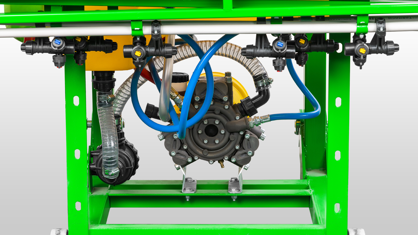 Рама и металлические детали опрыскивателя покрыты износостойкой порошковой краской, защищающей металл от мелких царапин и механического воздействия. При хранении на открытых площадках и воздействии влаги коррозия металла не происходит.