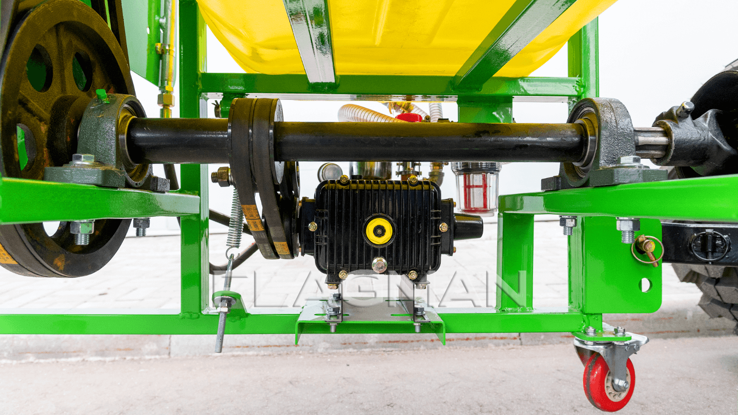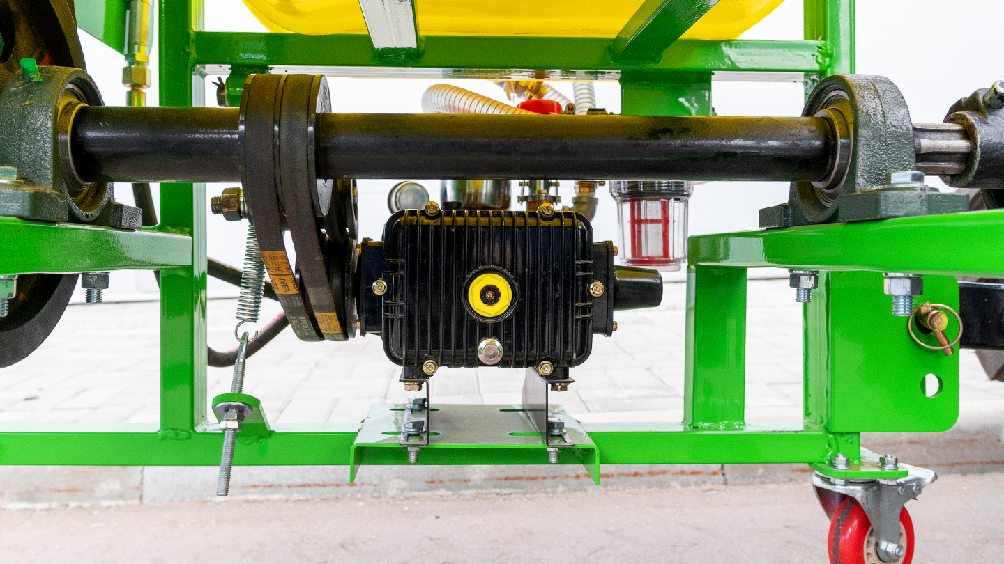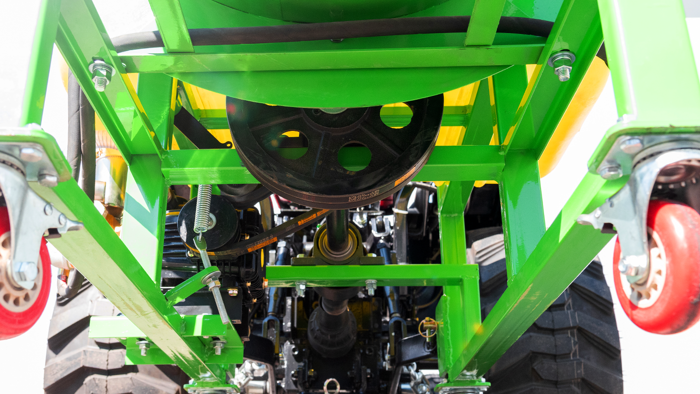 Силовой контур опрыскивателя сварен из профиля 45×45 мм — жёсткость без лишней массы. Пластины для крепления тяг навески — 8 мм. Роликовые колёса помогают катить машину к трактору и точно совмещать навеску. Жесткая база надежно держит вентиляторный модуль и бак при транспортировке и работе по неровностям.