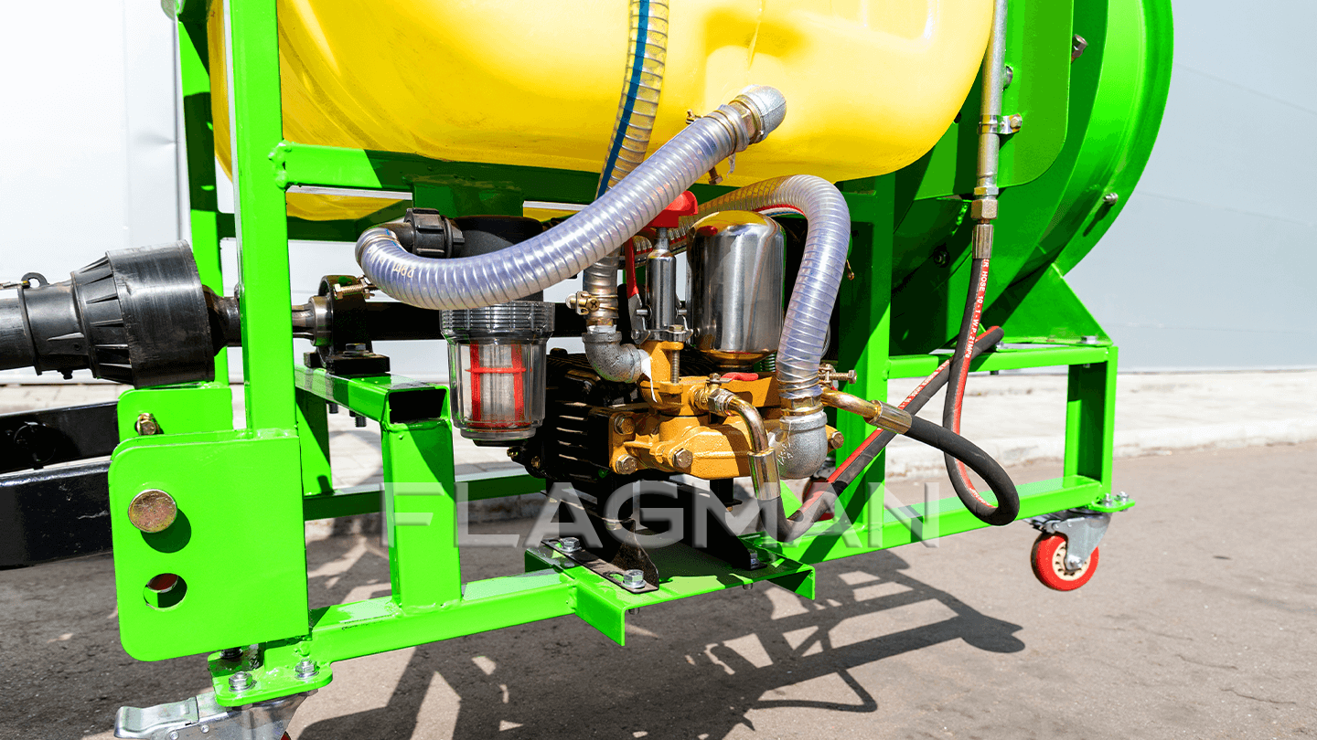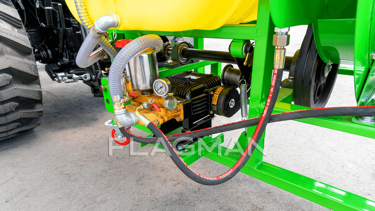 Опрыскиватель Flagman S300/1 работает в садах и виноградниках, где важны маневренность и равномерное осаждение капли. Модель рассчитана на тракторы от 15 до 60 л.с. с ВОМ 540 об/мин и навеской I/II классов. Основные плюсы модели: производительность насоса 80–100 л/мин при 10–35 бар и 10 латунных форсунок с поворотной двойной головкой.