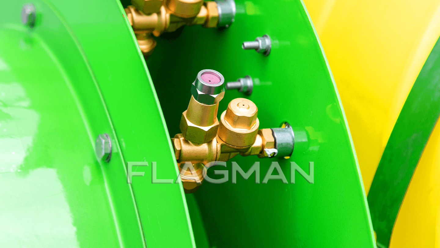 Поворотная головка объединяет две позиции форсунок с разным расходом и распылом. Латунный корпус и керамические распыливающие шайбы держат постоянный размер капли при агрессивной химии. Переворот головки осуществляется без инструмента — оператор за минуту подстраивает факел под фазу вегетации и необходимый распыл.