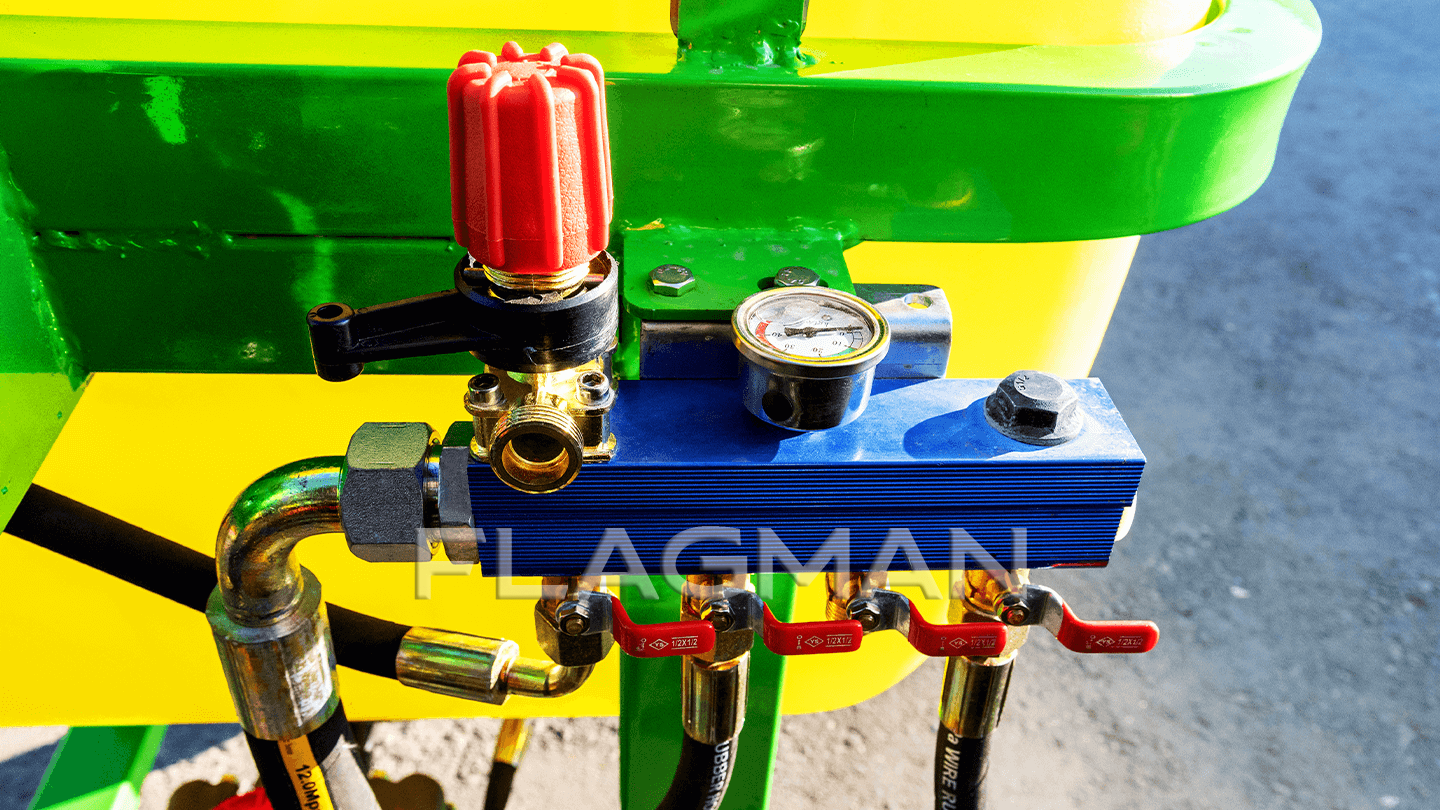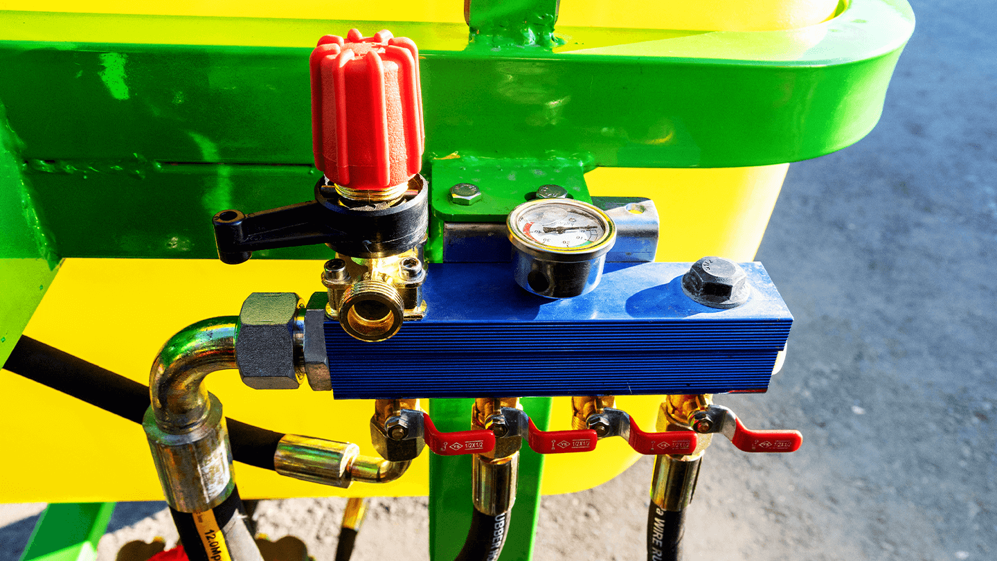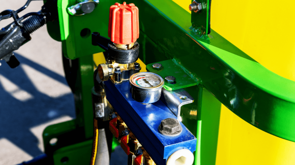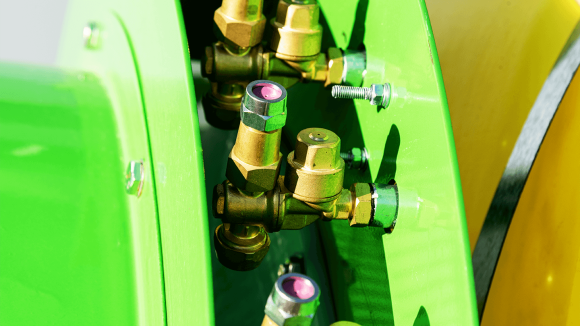 Распределитель размещен отдельно, оснащён регулирующим клапаном и легко читаемым манометром с рабочего места оператора. Левый и правый контуры отключаются независимо. Точная установка давления и дозы вместе с простой логикой органов управления повышают эффективность обработки и предотвращают перерасход.