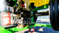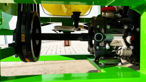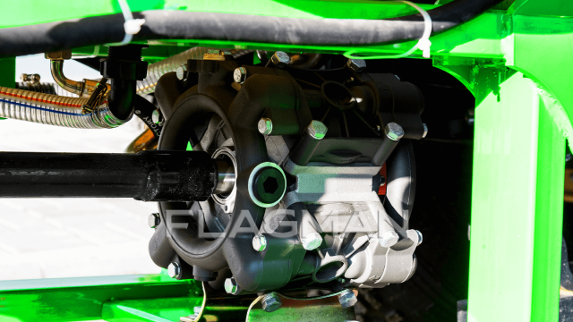 Четыре мембраны и утолщенный корпус поддерживают ровную подачу на весь коллектор. Рабочие параметры: 80–100 л/мин, 10-35 бар, частота 550–600 об/мин; необходимая мощность на валу всего 3 л.с. Конструкция устойчиво держит давление на 12 форсунках и эффективно снижает пульсации.