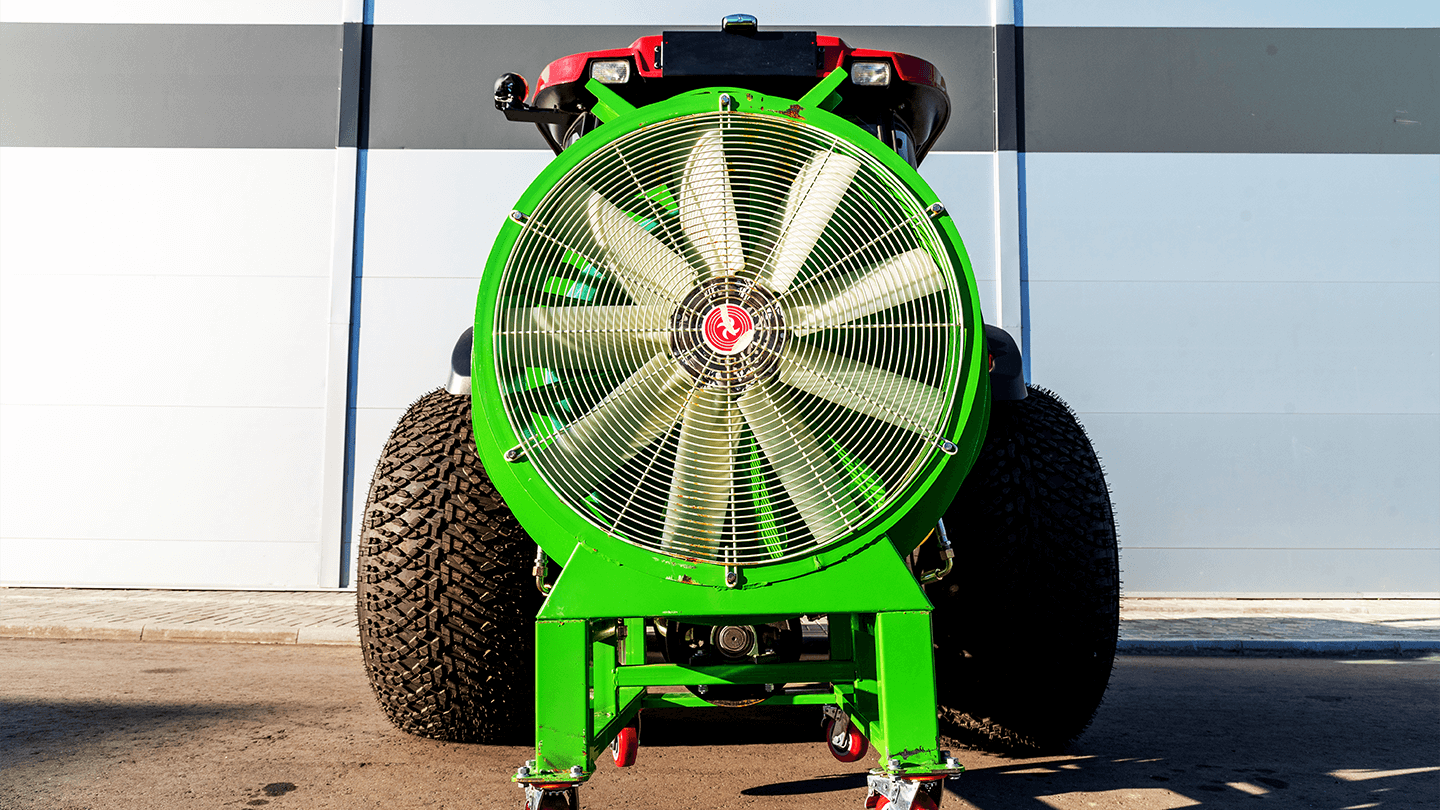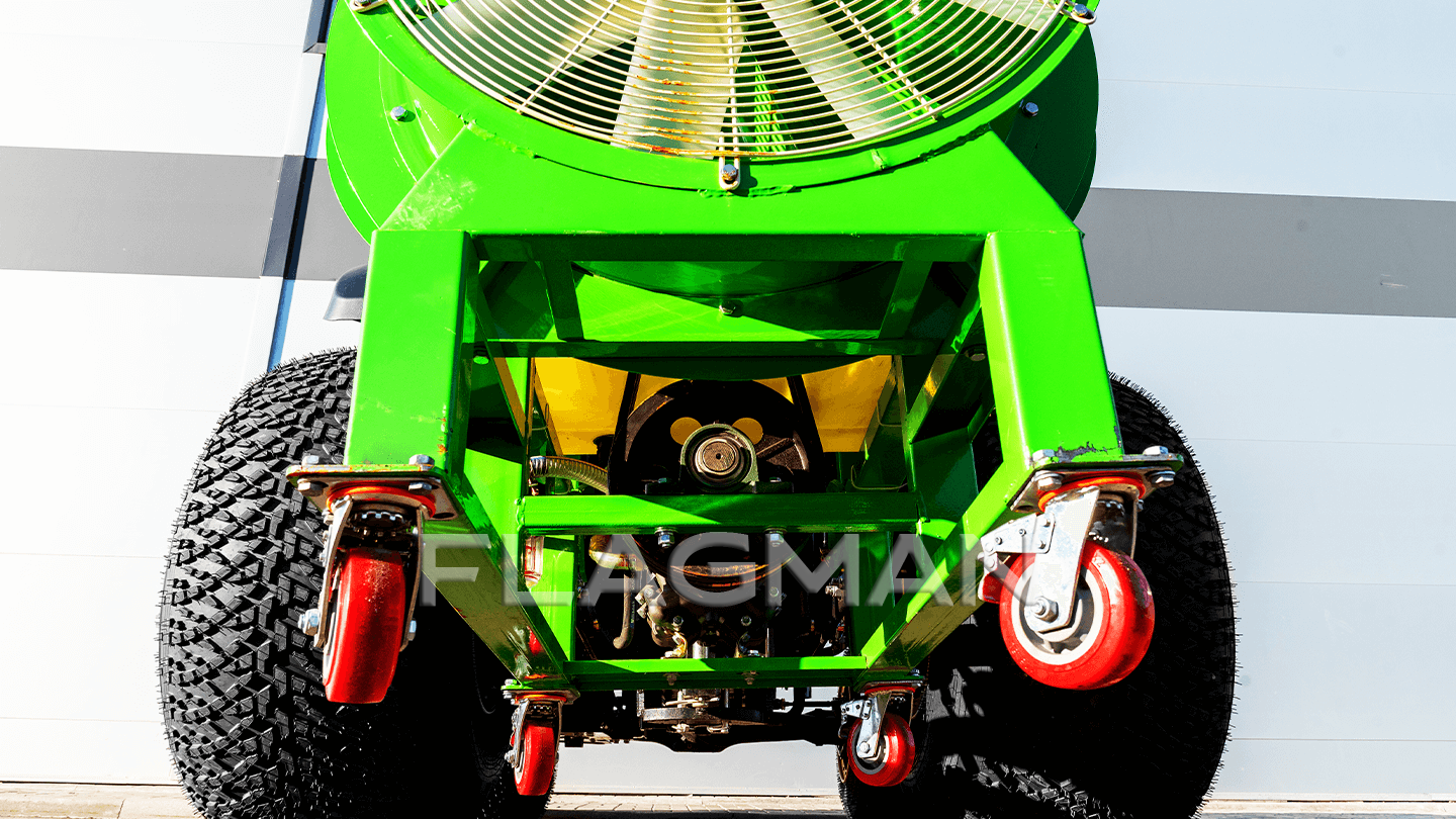Кожух из стали 4 мм жёстко фиксирует геометрию, нейлоновая крыльчатка сокращает инерционные нагрузки при разгоне и торможении. Диаметр вентилятора — 78 см. Отражатели над форсунками позволяют направлять поток по сторонам ряда. Сочетание жесткости и малой массы снижает вибрации узла.
