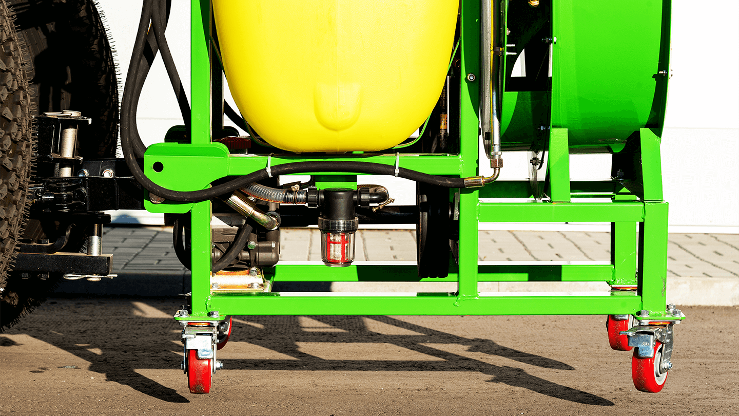 Силовой контур выполнен из профиля 80×40 мм с высоким запасом жесткости. Пластины крепления нижних тяг — 10 мм. Роликовые колёса помогают катить машину к трактору и точно совмещать навеску. Жесткая база надежно держит вентиляторный модуль и бак при транспортировке и работе по неровностям.