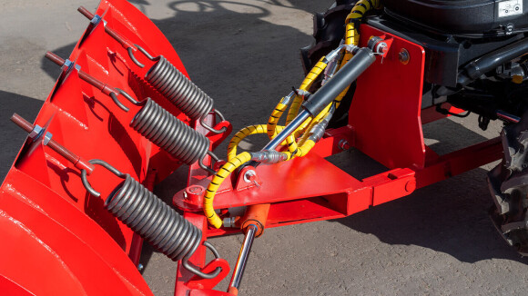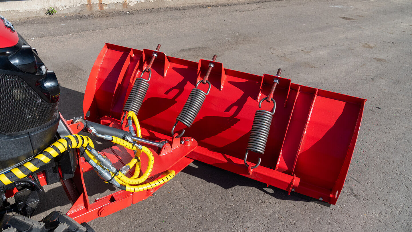 Защита отвала реализована при помощи пружин с натяжителями: при контакте с бордюром или камнем лопата отрабатывает удар через упругий элемент и отклоняется вперёд, разгружая несущую конструкцию и крепёж. Демпфирование снижает пик усилия на подрамник и рамку, уменьшая вероятность деформации и разбития посадочных мест пальцев. Натяжители настраивают преднатяг под характер покрытия.