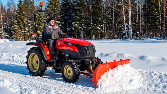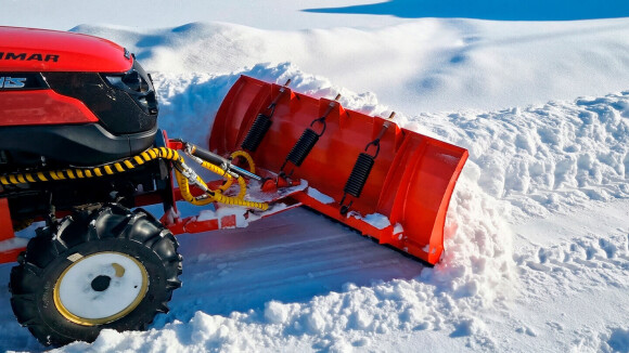 Рабочая ширина 1,6 м перекрывает колею трактора даже на газонных шинах. Масса 200 кг держит стабильный прижим к покрытию при сохранении легкой нагрузки на передний мост минитрактора. Отвал сбалансирован по производительности и манёвренности: он уверенно работает в проездах, на тротуарах и на участках с ограниченной зоной разворота.