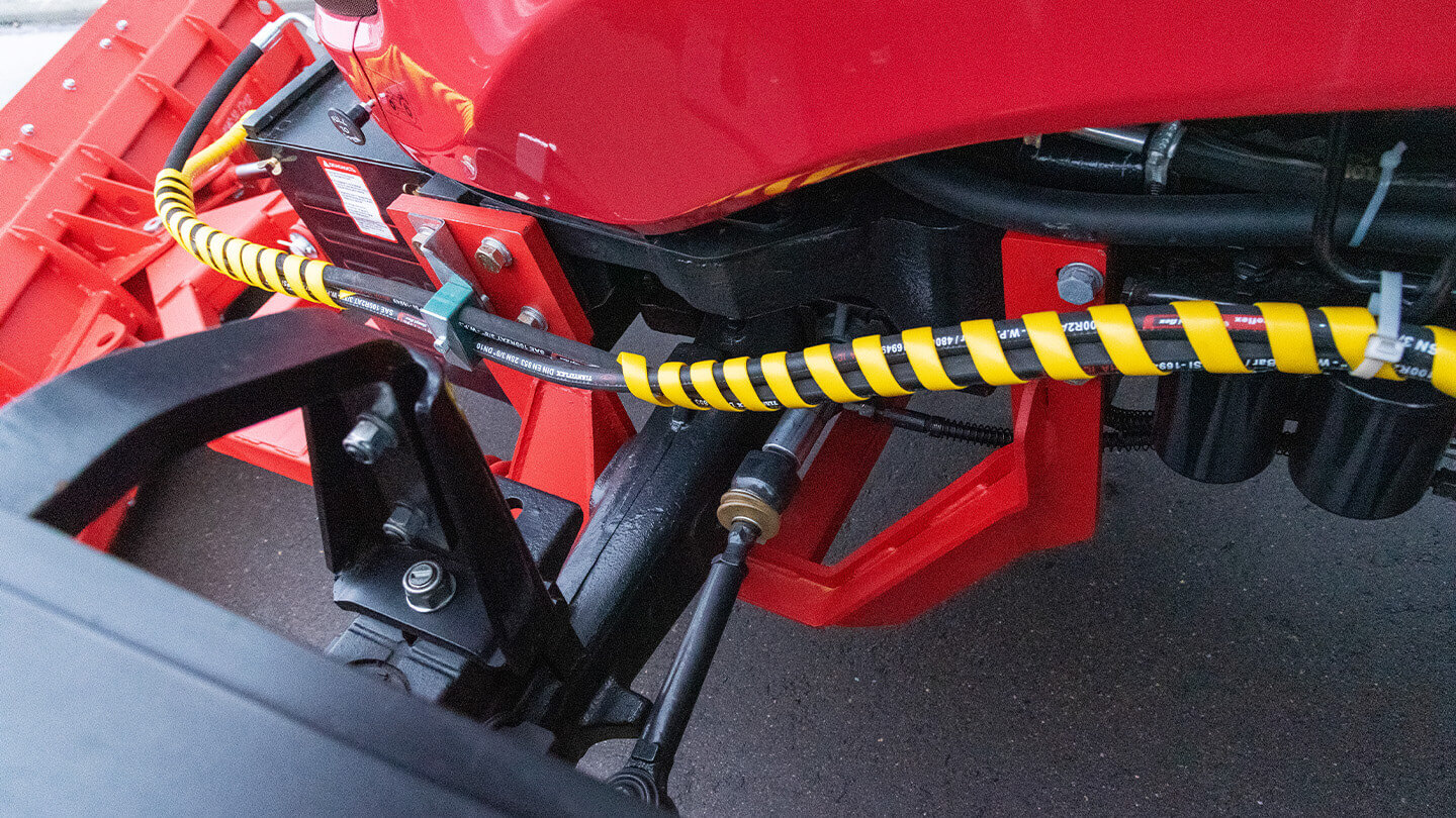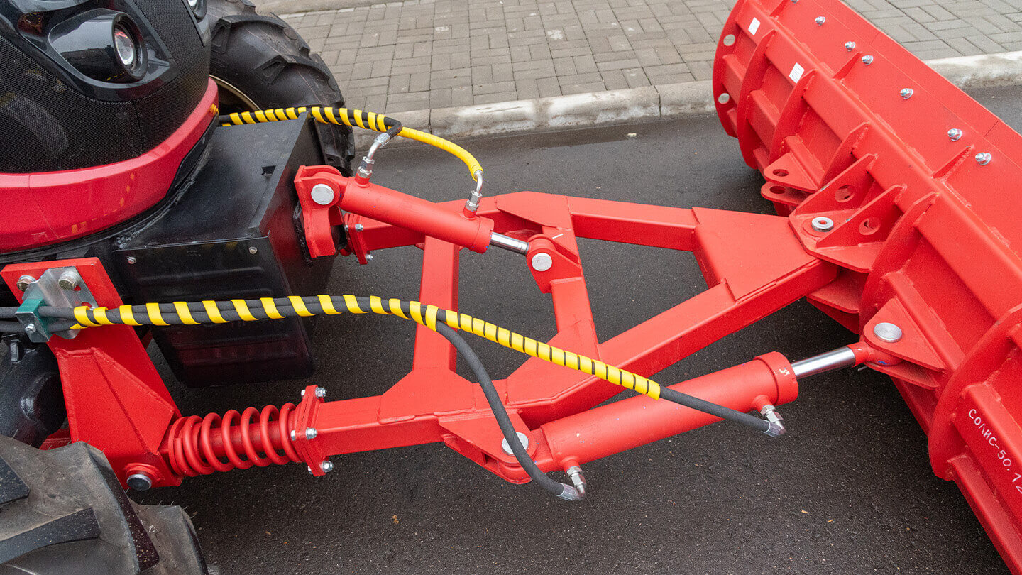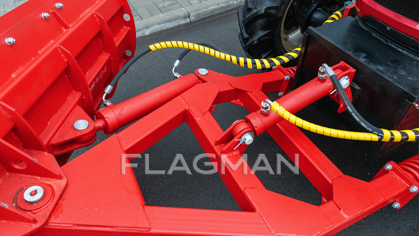 Гидравлика поставляется полным комплектом и подключается к распределителю трактора через быстросъёмные муфты. Центральный палец оснащён пресс-маслёнкой: регулярная смазка снижает износ шарнирных соединений и сохраняет лёгкость поворота отвала.
