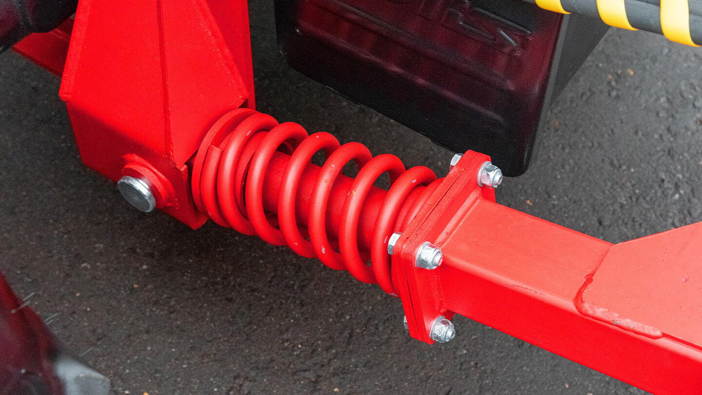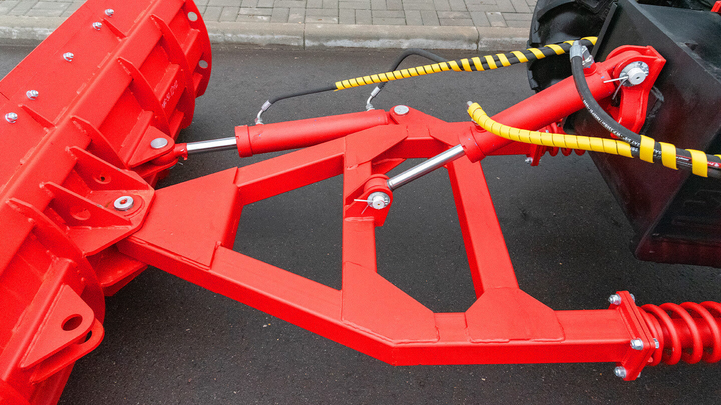 В раме применён амортизирующий узел с пружинами и направляющими: при наезде на бордюр, камень или плотную наледь отвал отрабатывает удар, снижая пик нагрузки. Такой режим уменьшает риск деформации рабочей части и перегрузки силовых точек крепления. Для оператора эффект выражается в стабильном ходе без резких рывков и меньшей «вибрации» на руле.