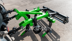 Сварная несущая балка выполнена из профильной трубы 80 × 80 × 6 мм и усилена диагональной распоркой, исключая деформации при рывковых нагрузках. Массивные щеки трехточечной навески вырезаны из листовой стали и приварены по всему контуру, поэтому узел сохраняет геометрию даже при работе в твёрдой почве. Рабочие стойки фиксируются высокопрочными U-образными стремянками. Весь агрегат защищен порошковой окраской.