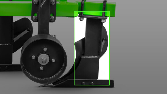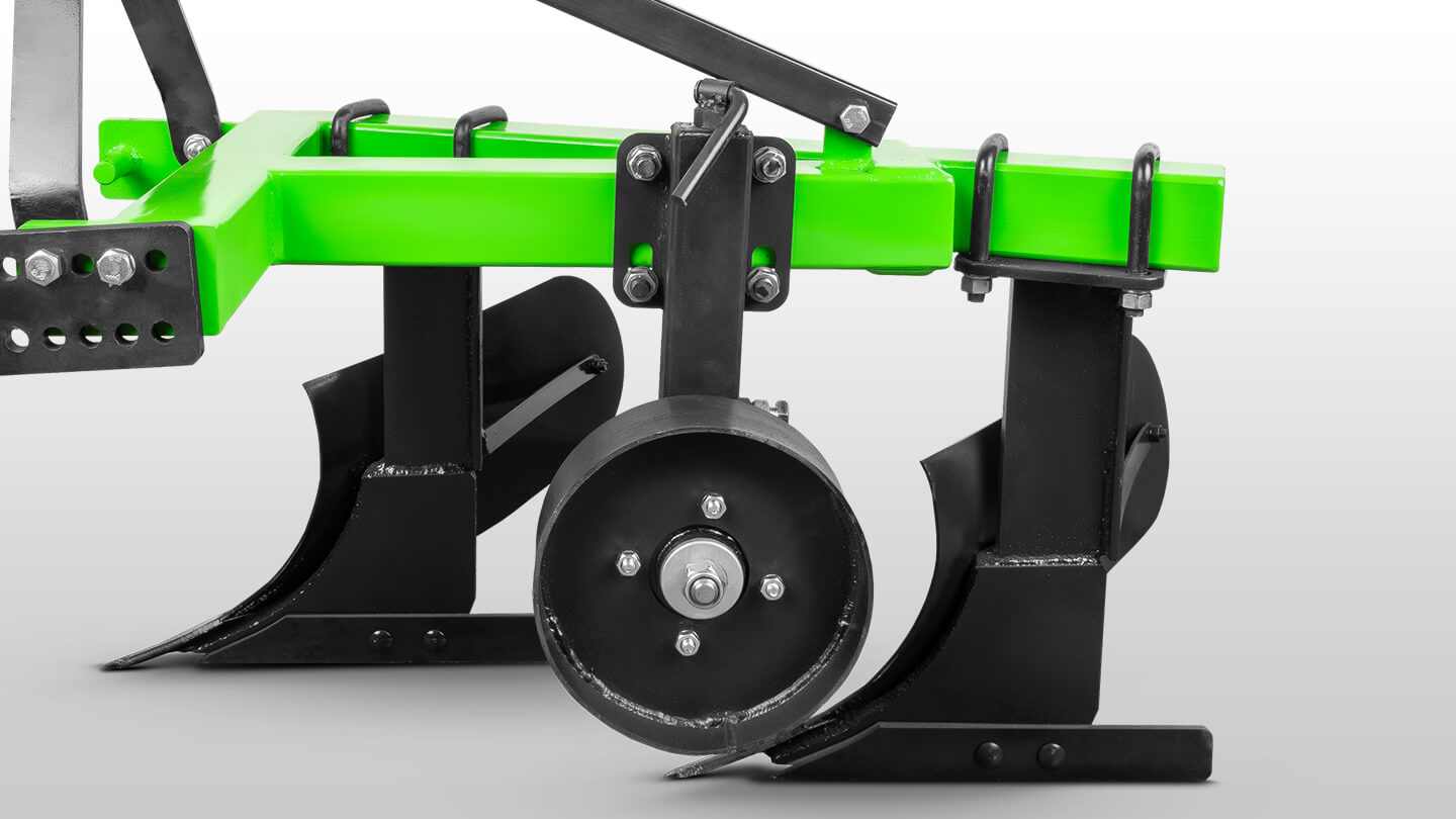Металлическое опорное колесо обеспечивает регулировку глубины обработки, дополнительно поддерживая стабильную работу плуга. Широкая конструкция колеса препятствует проваливанию в грунт, а регулировка глубины осуществляется плавно с помощью винтового механизма. Металлическое исполнение исключает износ и проколы.