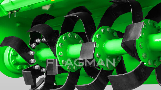 Ротор почвофрезы Флагман выполнен из толстостенной трубы диаметром 75 мм. Каждый фланец толщиной 11 мм удерживает 6 ножей из высокопрочной борсодержащей стали L-типа, что делает фрезу эффективной для измельчения пожнивных остатков и работы на сухих почвах.
