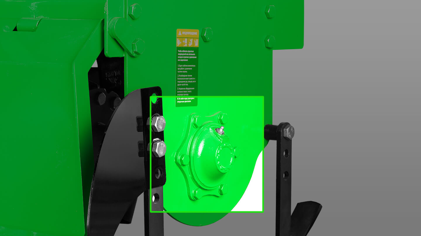 Опорные полозья служат базовым элементом контроля глубины: они предотвращают излишнее заглубление фрезы в грунт, стабилизируют положение агрегата и позволяют точно выставлять глубину обработки до 15 см за один проход. Для более глубокой проработки допускается поэтапная обработка: при трех проходах по одному месту глубина может достигать до 25 см, при этом снижается риск перегрузки привода и улучшается качество крошения и перемешивания слоя. Левый полоз оснащен металлическим защитным экраном, который закрывает крышку привода от ударов комьев, камней и растительных остатков.
