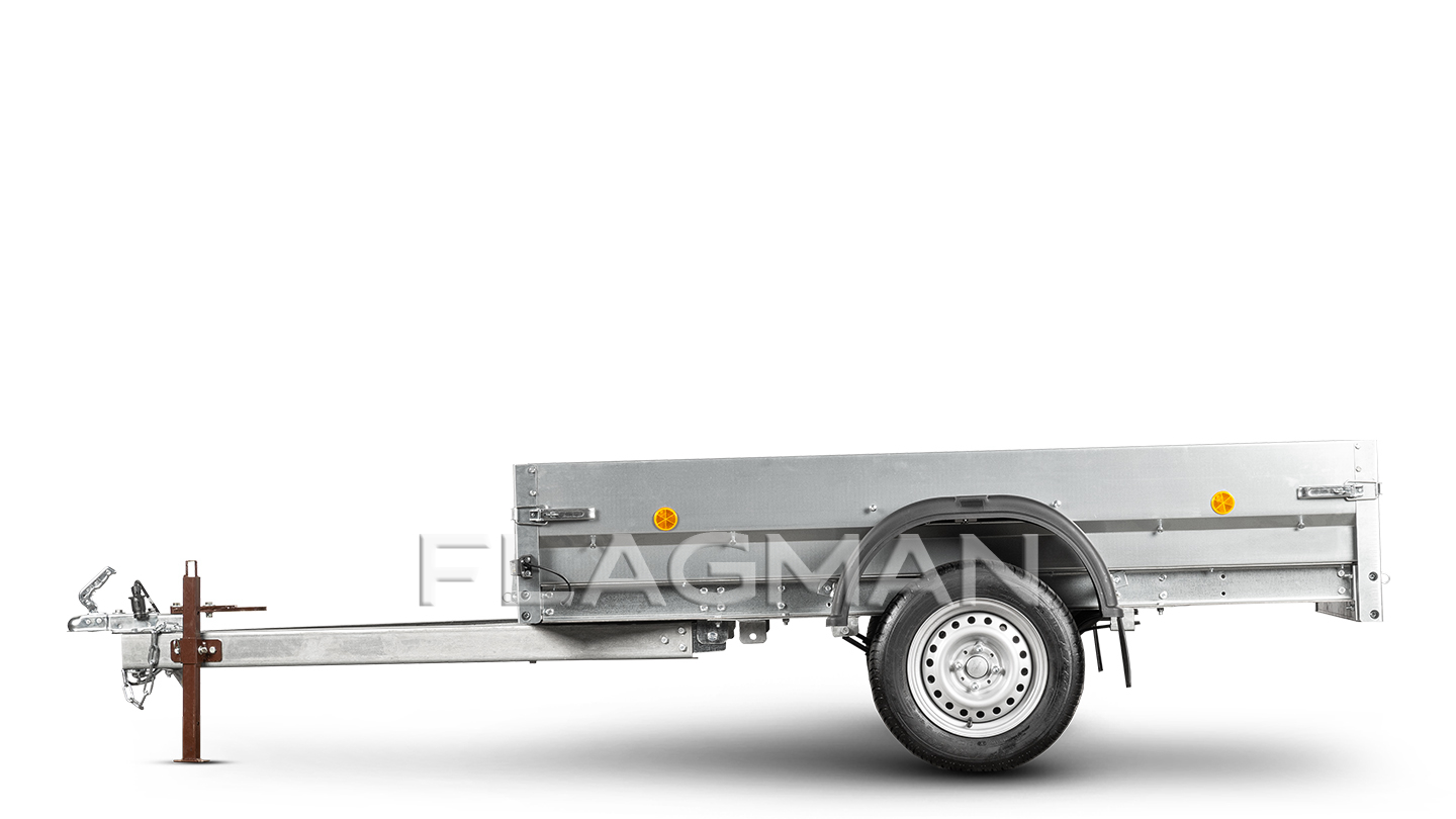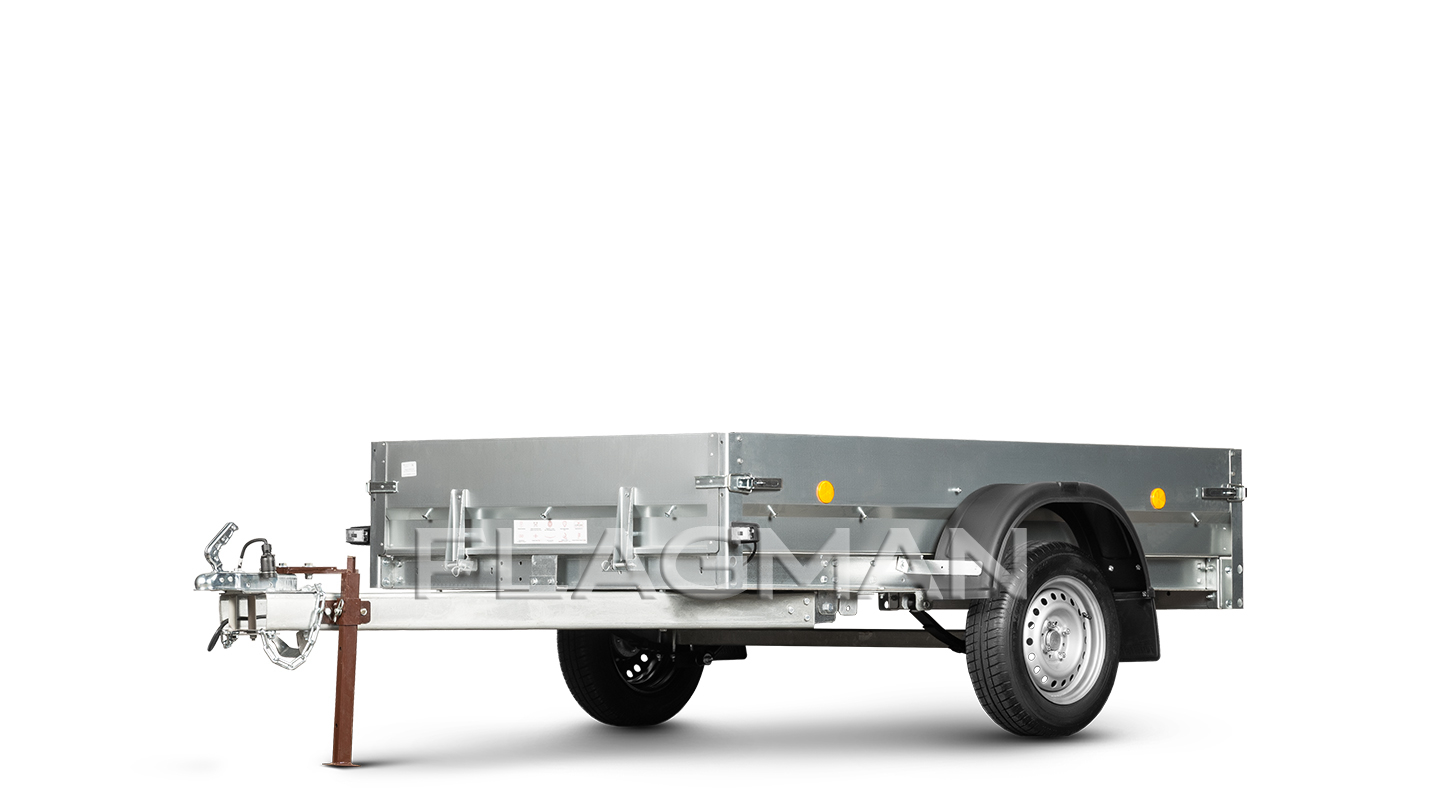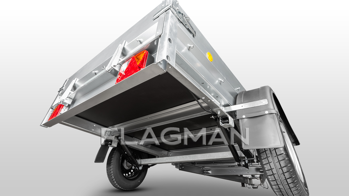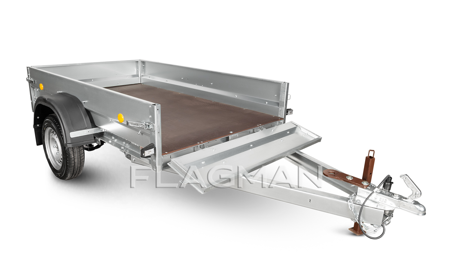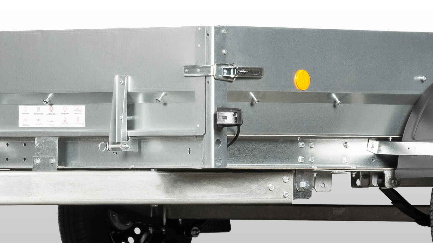 Задний и передний борта прицепа откидные, с возможностью полного отсоединения. Такое решение позволяет перевозить строительный материал и другой крупногабаритный груз. Замки крепления удобные для использования, механизм фиксации предохраняет от случайного открытия. Пол прицепа из ламинированной фанеры 9 мм, устойчивой к воздействию влаги и легких ударов при погрузке-разгрузке.