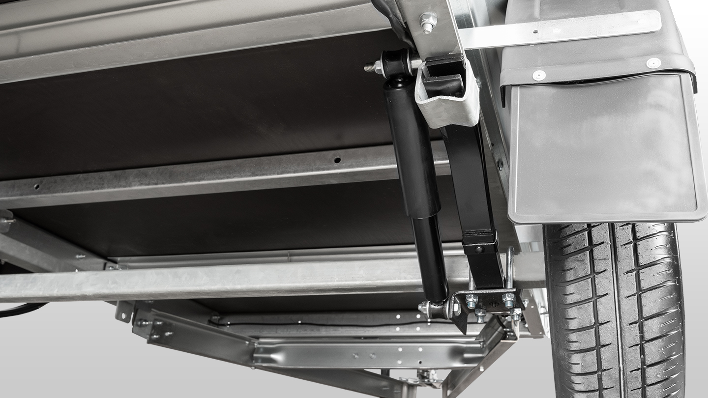 Листы рессоры переменного сечения с прогрессивной упругой характеристикой обеспечивают плавность хода прицепа во всем диапазоне эксплуатационных нагрузок. Переход на резинометаллические сайлентблоки и шарнирные серьги позволил исключить стуки и удары, возникающие в зазорных соединениях рессоры. Гашение колебаний подвески осуществляется двумя гидравлическими амортизаторами.