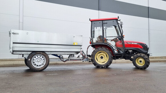 При грузоподъемности в 1100 кг. собственный вес прицепа составляет 400 кг. Он спроектирован с учетом правильной развесовки, что говорит о низкой нагрузке на ходовую часть и навеску трактора. Кузов 2,3 на 1,6 метра с высотой борта 49 см, а погрузочная высота 75 см удобна для ручной загрузки. Угол поднятия платформы 40 градусов.