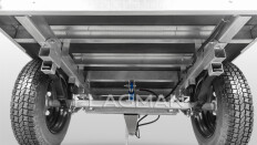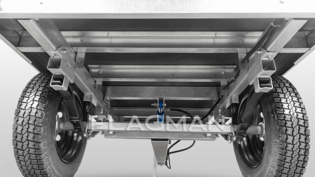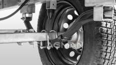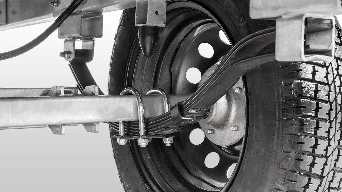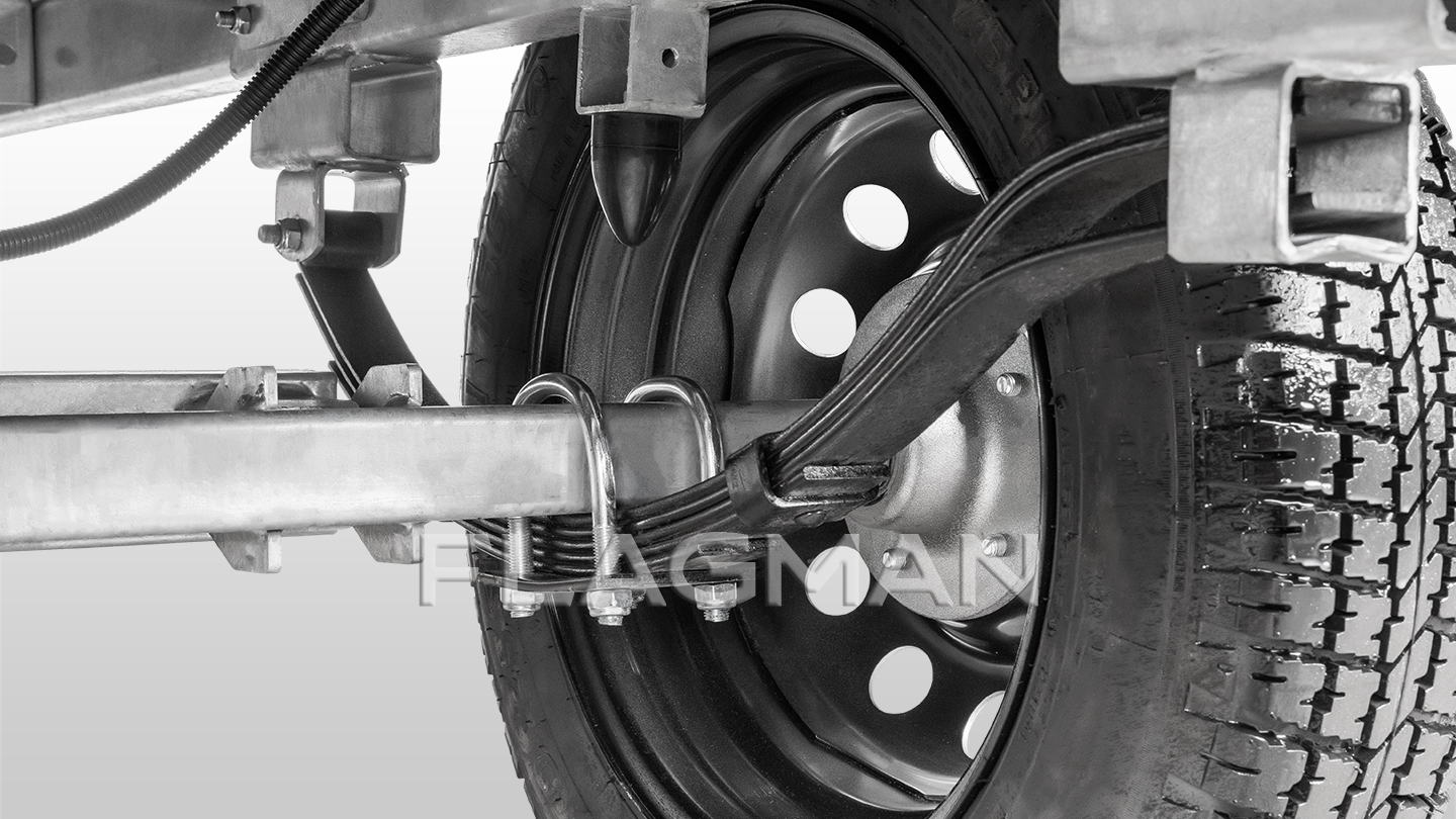 Подвеска прицепа выполнена на основе листовых рессор переменного сечения. Благодаря прогрессивной упругой характеристике подвеска эффективно гасит вибрации, повышая комфорт и стабильность при движении. Резиновый отбойник ограничивает ход подвески предотвращая касание колеса о дно кузова.