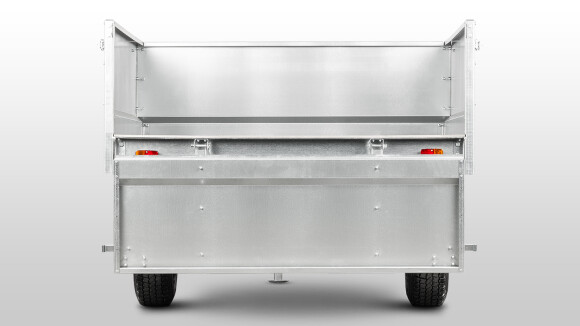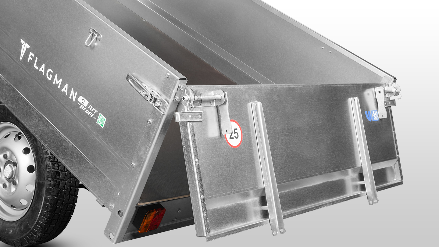 Задний борт прицепа оснащен удобной системой открытия в двух вариантах: открытие вниз обеспечивает комфортную загрузку и выгрузку крупногабаритных грузов, таких как мешки или пиломатериалы, а открытие вверх подходит для разгрузки сыпучих материалов, предотвращая их давление на борт и защищая крепления от повреждений.